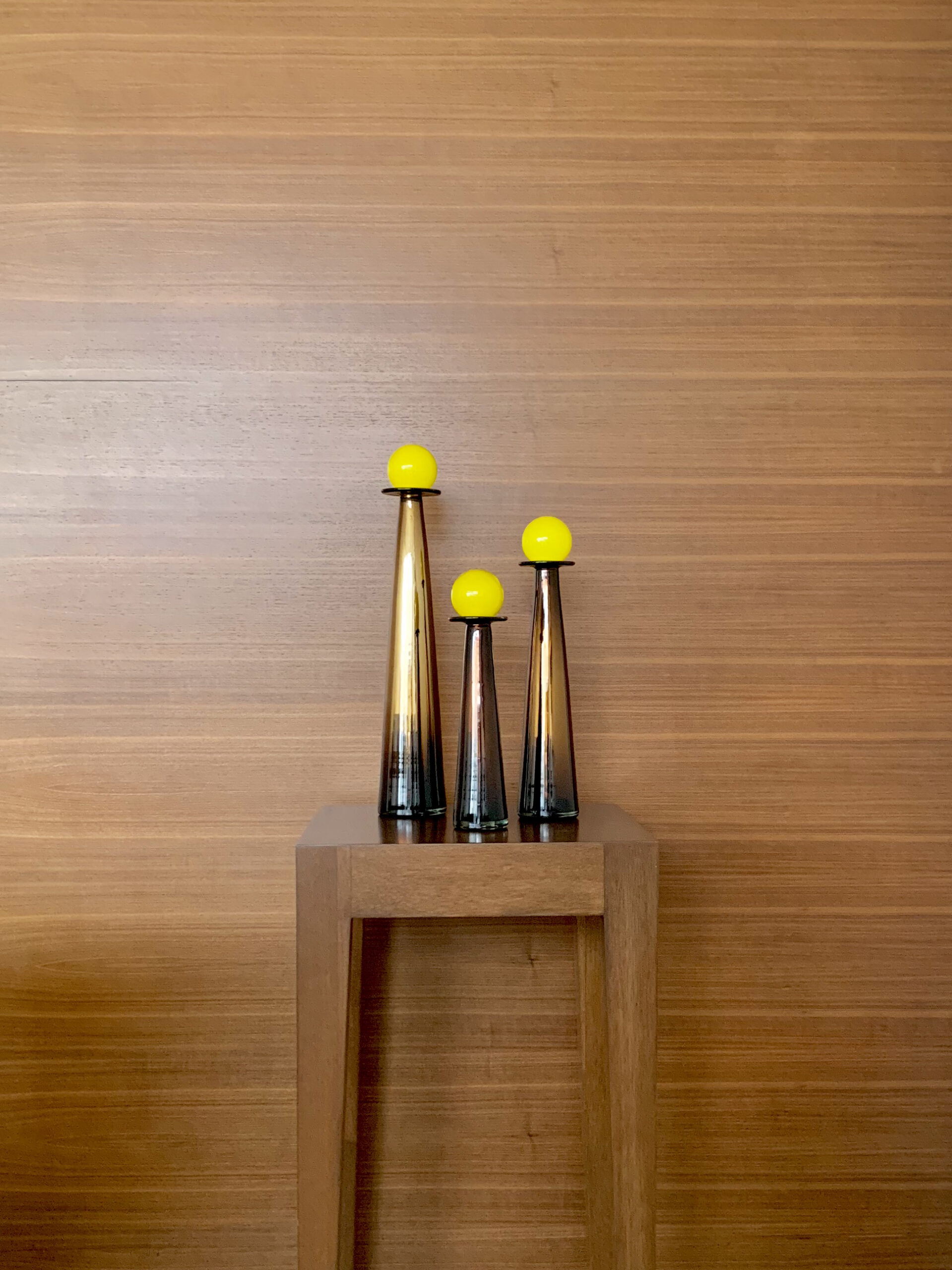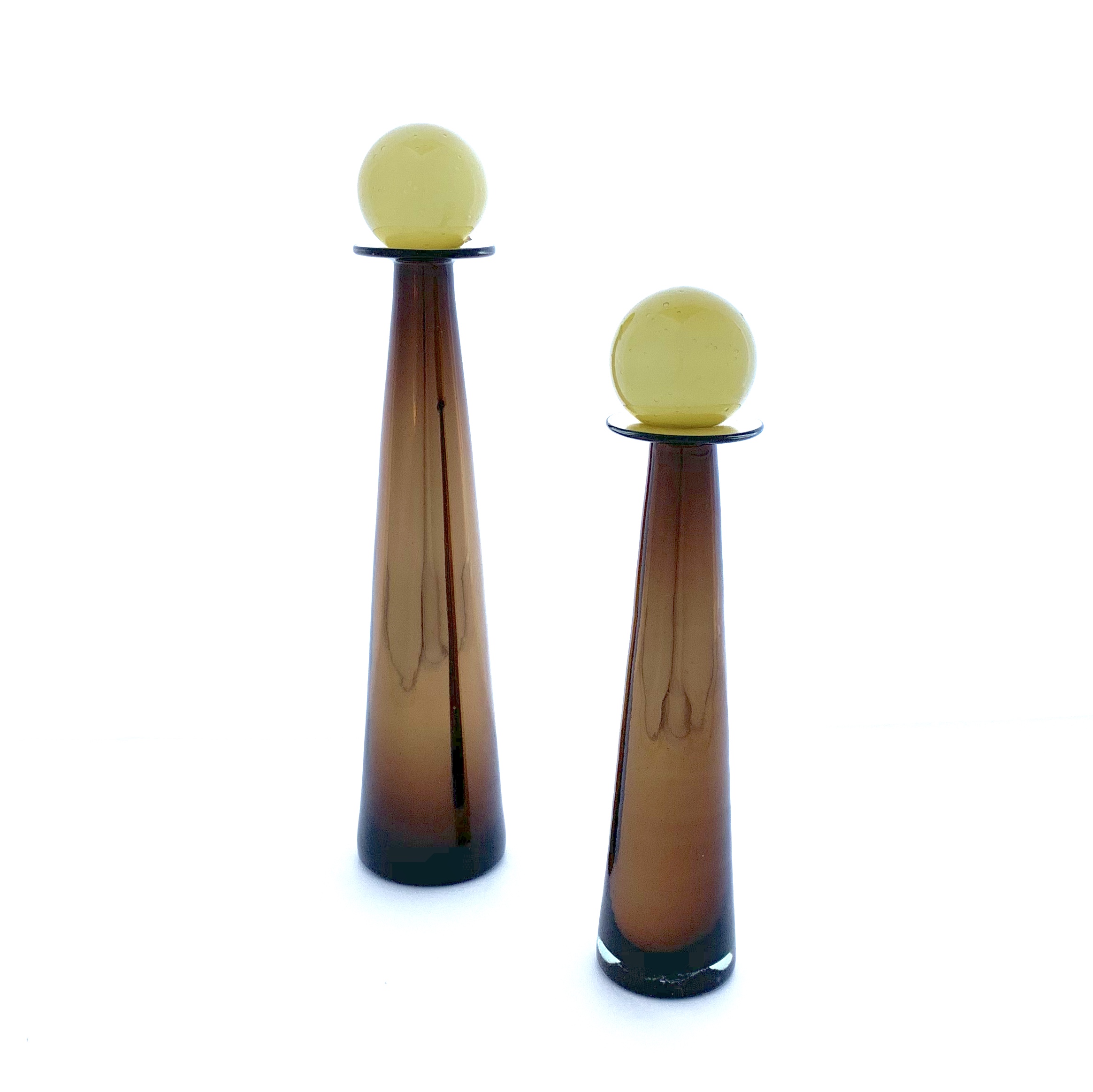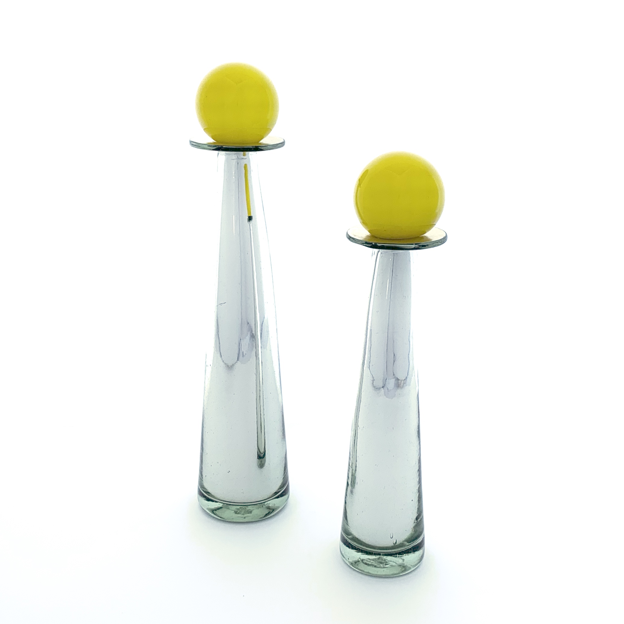 Estas esculturas de vidrio soplado destacan por su diseño contemporáneo y elegante, combinando formas estilizadas y detalles en tonos metálicos. Su tamaño es chico por lo que son piezas perfectas para colocar en una sala, comedor o recibidor, ya sea juntas o por separado, y dar un aire artístico y exclusivo a cualquier rincón de tu hogar.
