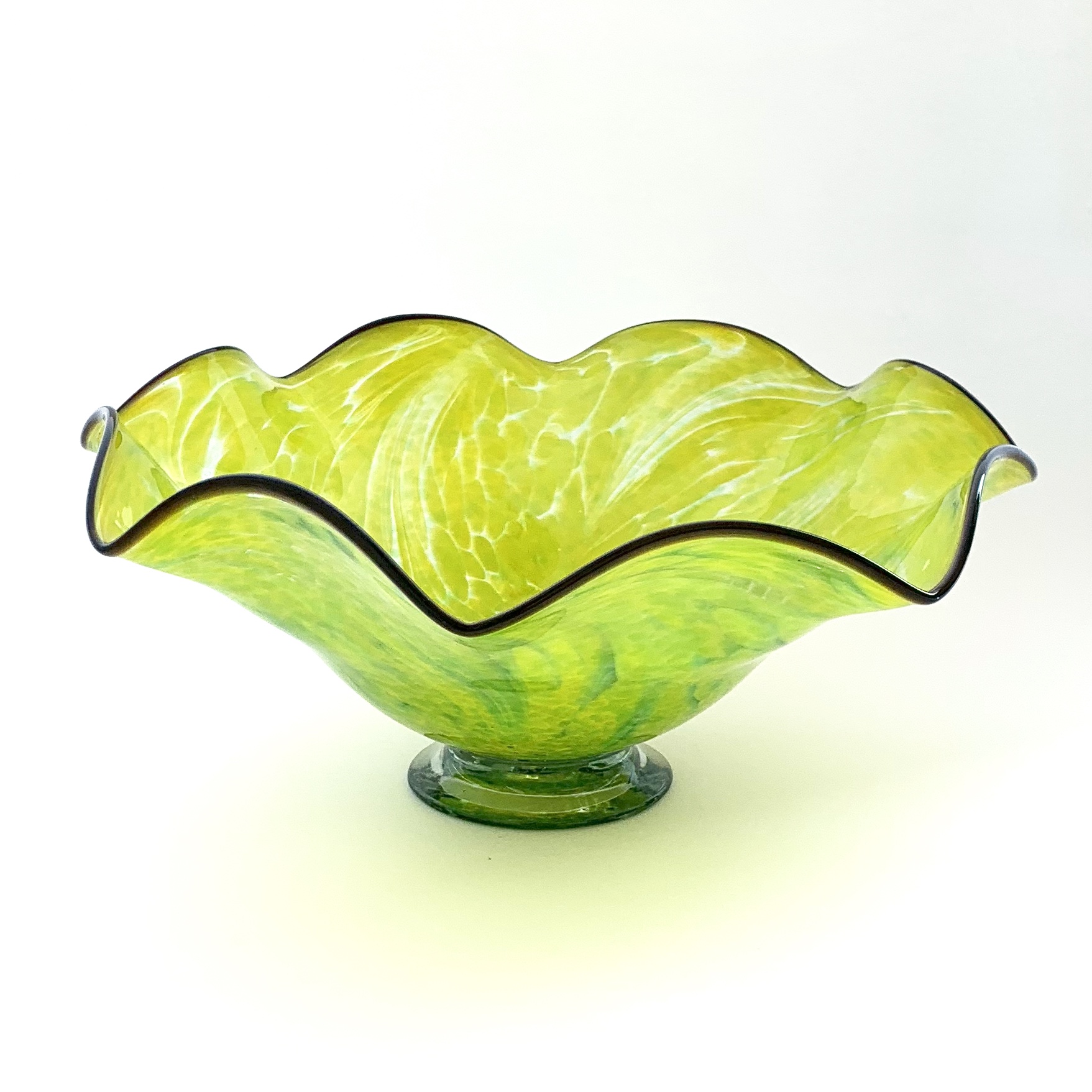 Este frutero decorativo, elaborado en cristal soplado, destaca por sus formas suaves y bordes ondulados que le dan un toque artístico y sofisticado. Mide aproximadamente 30 cm de diámetro y 15 cm de alto, lo que lo hace ideal para colocarse como centro de mesa, en una barra o consola, o en la recepción de una oficina. Puede utilizarse para exhibir frutas, arreglos de esferas decorativas, o simplemente como pieza central en tu decoración. Es un excelente regalo para quienes buscan elegancia y estilo en su hogar u oficina.