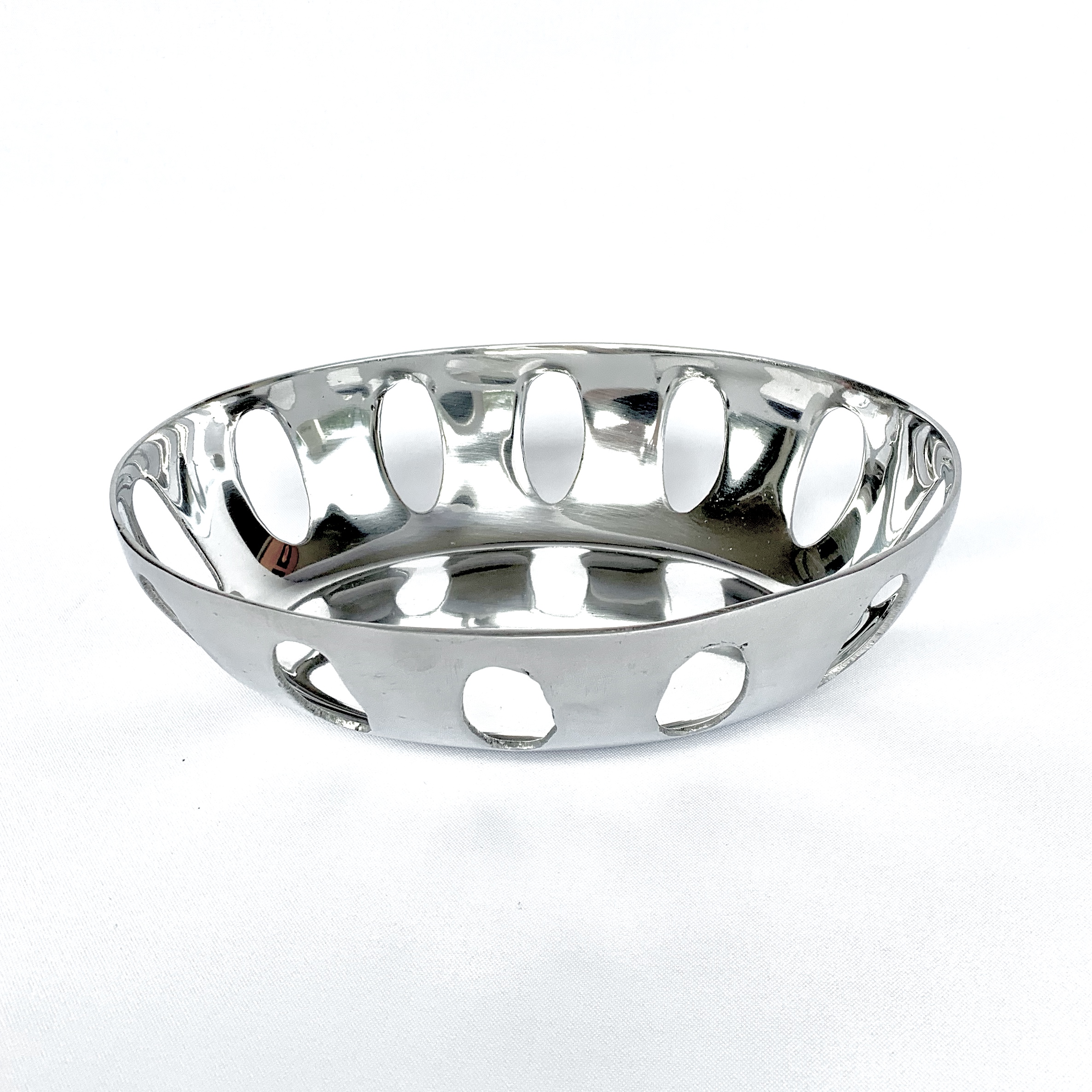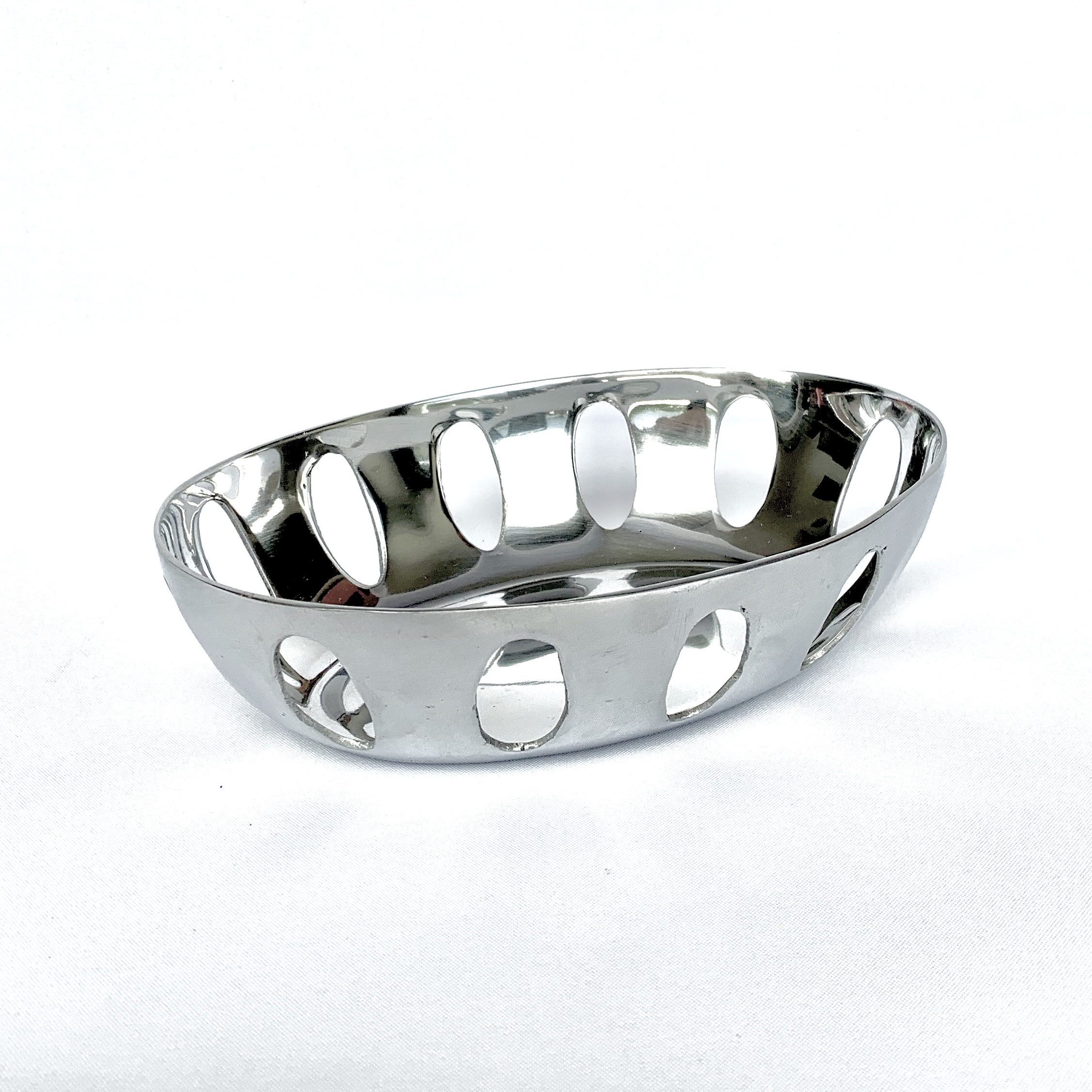 Este frutero en pewter presenta un diseño contemporáneo con aberturas ovaladas que ofrecen un toque elegante y funcional. Mide aproximadamente 25 cm de largo por 15 cm de ancho y 7 cm de alto, lo que lo hace ideal para colocar sobre la mesa del comedor, una barra o el recibidor. Es perfecto para exhibir frutas frescas, esferas decorativas o simplemente utilizarlo como acento moderno en salas u oficinas. Su acabado brillante añade sofisticación y es una excelente opción para quienes buscan detalles originales en la decoración.